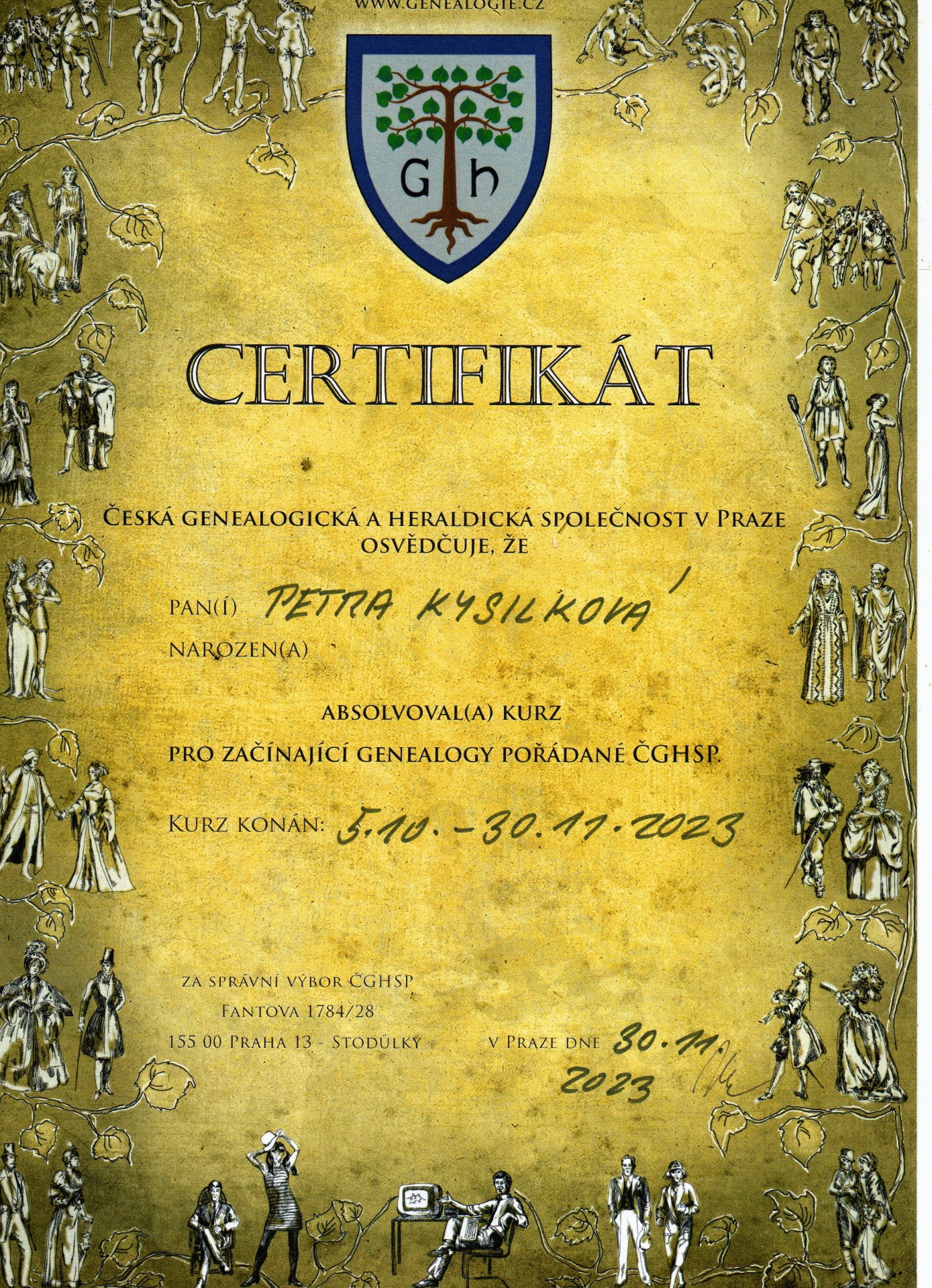 Jsem profesionální genealog se zájmem o historii rodin, archivní materiály a příběhy, které utvářejí naši identitu. Vystudovala jsem obor Počítačová podpora v archivnictví na katedře Pomocných věd historických a archivnictví Filozofické fakulty Univerzity Hradec Králové. Genealogické základy jsem získala v Kurzu pro začínající genealogy pořádaném Českou genealogickou a heraldickou společností v Praze. Dále jsem se zúčastnila kurzu Paleografie taktéž pořádaném Českou genealogickou a heraldickou společností v Praze.